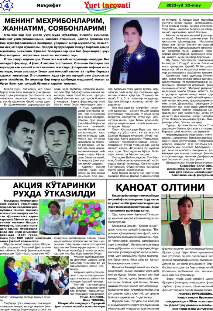 Shahrisabz shahar 7- maktabda Hayot go’zal yashash uchun 1001 ta sabab aksiyasi doirasida o’quvchilar bilan olib borgan tadbirlar bo’yicha maqola chop etildi.